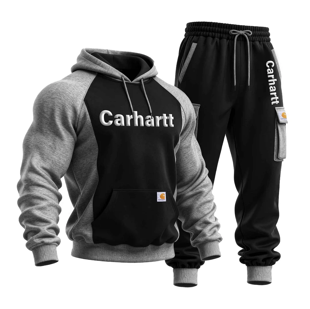 Men's Vintage Foam Print Black And Gray Color Block Pocket Hoodie And Sweatpants Jogger Set